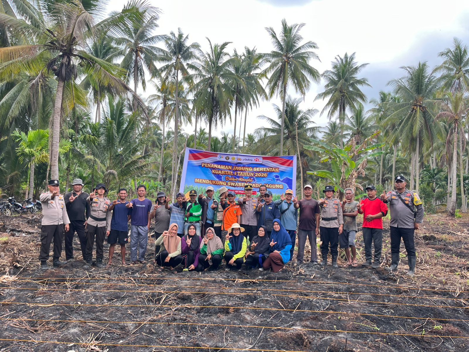 AksaraNews.com, Sungai Guntung_Inhil — Polsek Kateman bersama pemerintah desa dan masyarakat melaksanakan kegiatan penanaman jagung serentak Kuartal I Tahun 2026 sebagai langkah nyata mendukung program swasembada pangan nasional. Kegiatan tersebut digelar pada Sabtu (7/3/2026) sekitar pukul 09.00 WIB di Dusun 1, Desa Tanjung Raja, Kecamatan Kateman, Kabupaten Indragiri Hilir.