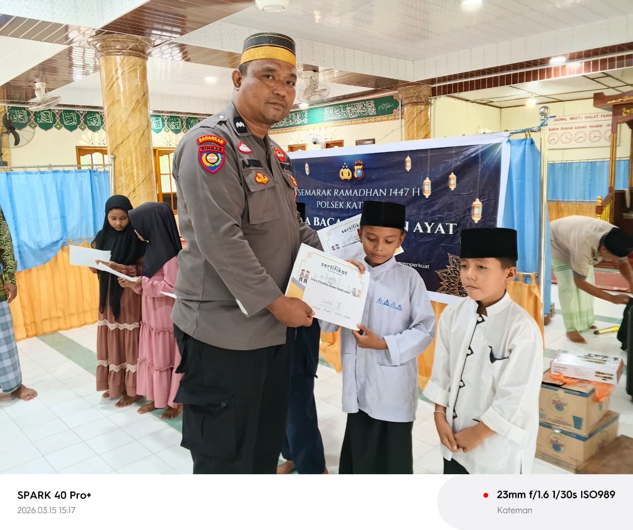 AskaraNews.com, Sungai Guntung_Kateman – Upaya menumbuhkan kecintaan generasi muda terhadap Al-Qur’an terus dilakukan di Kecamatan Kateman. Salah satunya melalui kegiatan lomba adzan dan hafalan ayat pendek tingkat anak-anak yang digelar Polsek Kateman di Masjid Al-Huda Kampung Baru, Desa Tanjung Raja, Minggu (15/3/2026).