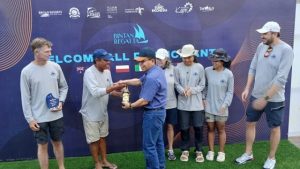 Kepala Bakamla RI Laksamana Madya Dr Irvansyah menyerahkan apresiasi kepada skipper Edwin Low dan crew kapal layar Skybird finish pertama passage race kelas Keelboat PY Division Bintan Regatta 2026.