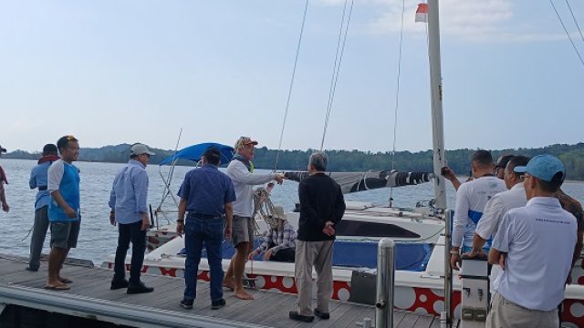 Laksamana TNI (Purn) Dr Marsetio bersama Frans Gunara dan Abdul Wahab menyambut kedatangan David Steel skipper asal Amerika Serikat kapal layar Dot Dot Dot peserta Bintan Regatta 2026 di Pelabuhan Marina Bintan Resorts.